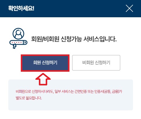 2. 인감증명서 인터넷 발급은 "공동인증서 혹은 금융인증서"로 로그인 후 발급이 가능합니다. [회원 신청하기] 선택 후 [공동인증서] 혹은 [금융인증서]를 선택해 로그인합니다. 아래는 인감증명서 발급 바로가기 링크입니다.